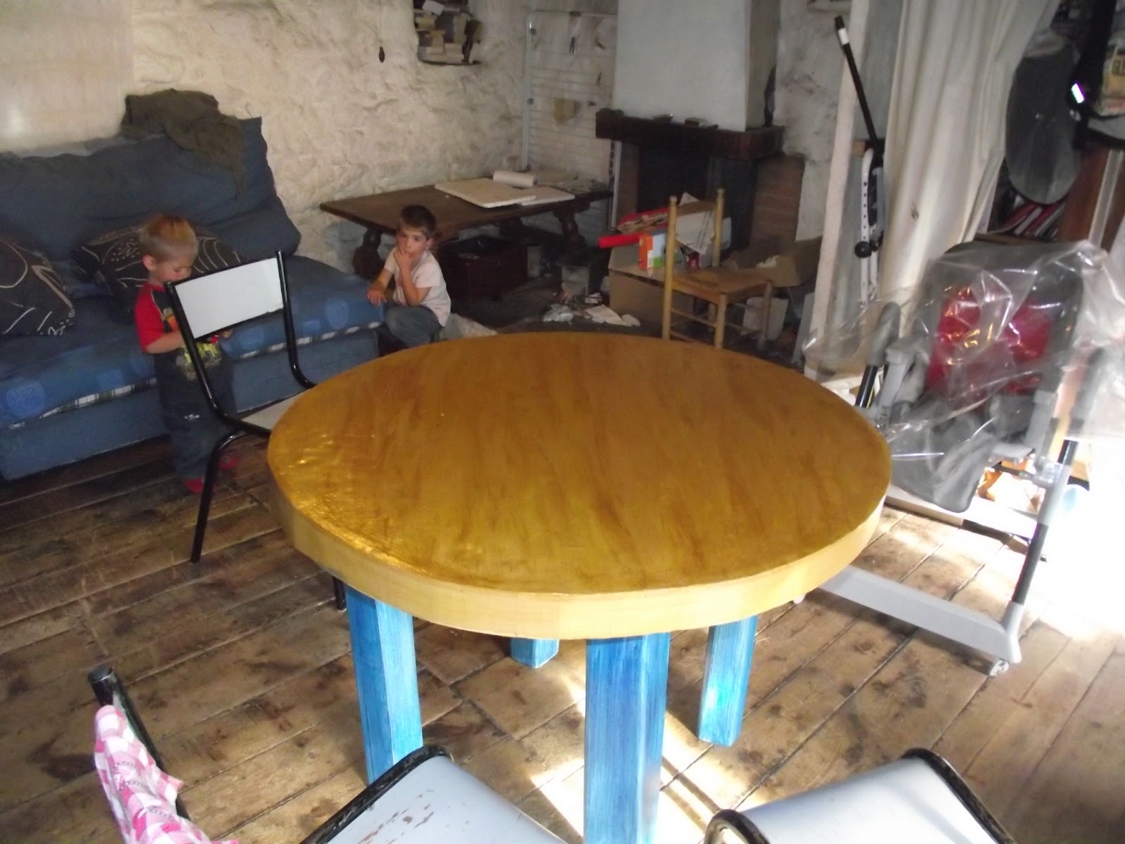 Avec un nouveau canapé il apparait clairement que le table démesurée coupe la pièce et qu’une table pour 6 ronde sera bien plus adapté à notre vie de famille. A ma disposition, du carton, des pigments naturelle maison, du vernis et du kraft gommé.